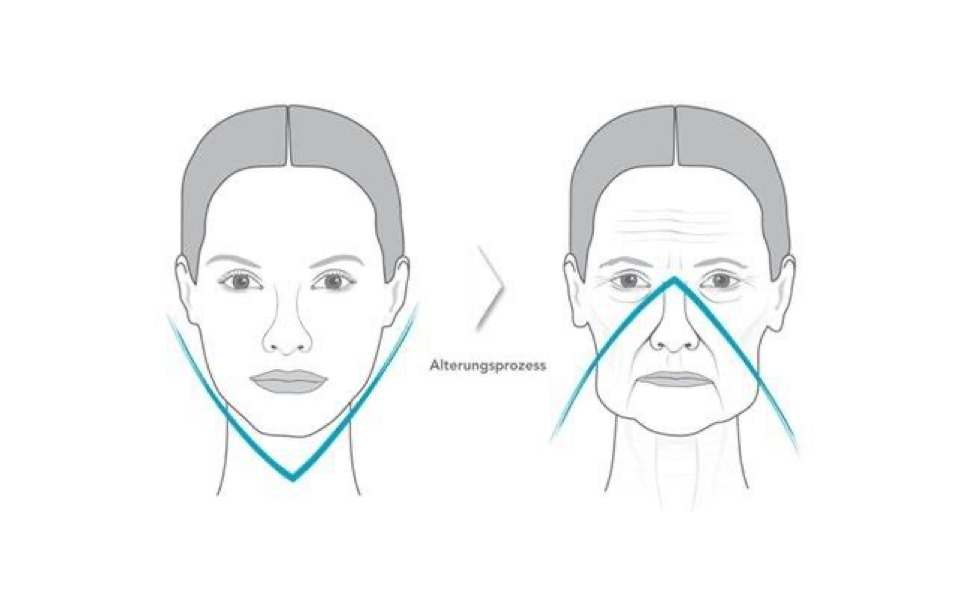 Der Alterungsprozess beginnt etwa ab dem 30. Lebensjahr. Man spricht vom sogenannten „Dreieck der jugendlichen Schönheit“: Das ovale Gesicht zeigt mit der Spitze zum Kinn nach unten. Dieses straffe, wohlgeformte Gesicht verändert sich mit hohen Gewichtsabnahmen oder dem natürlichen Alterungsprozess. Der Mittelpunkt des Gesichtes verlagert sich immer mehr nach